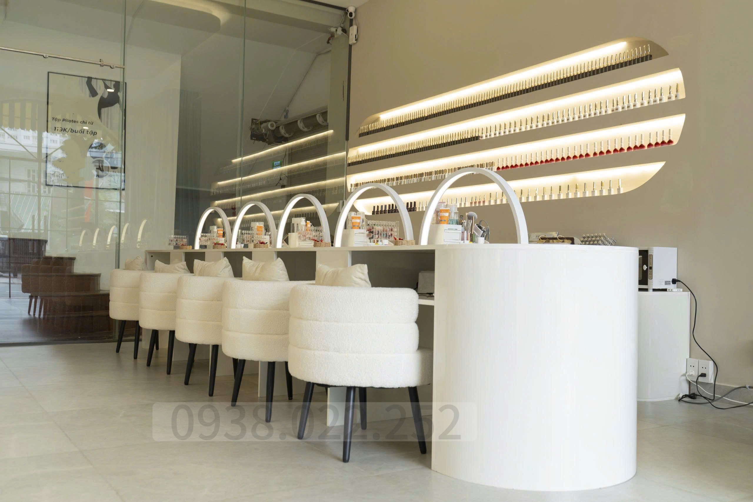 🔹 Khu Nail: Ghế nail, sofa, bàn – tủ chuyên dụng, bồn – bục nail, quầy lễ tân, két sắt, đầy đủ dụng cụ nails – mi – spa.