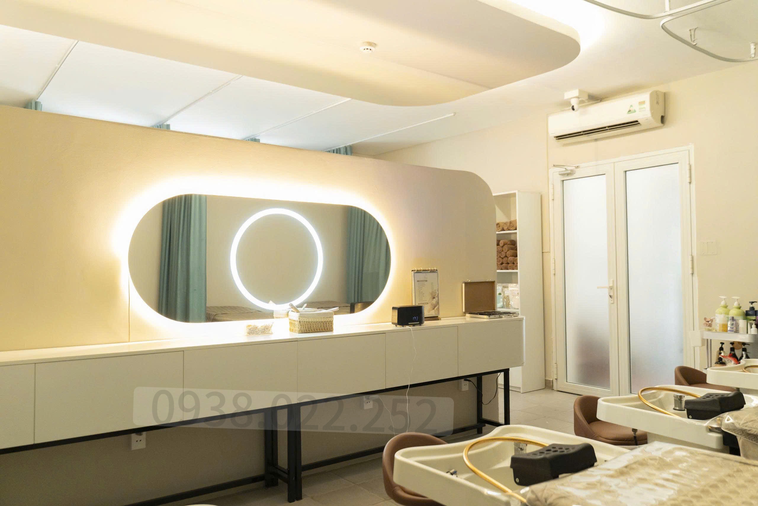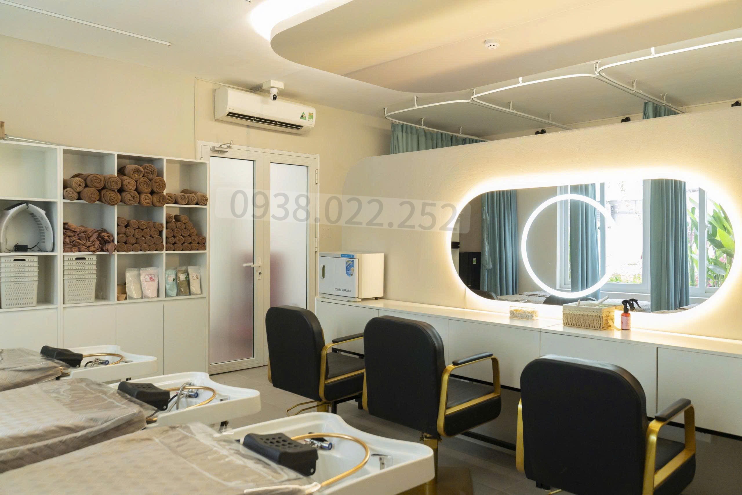 🔹 Khu Spa: Giường spa, giường gội + vòm, gương led, tủ đồ, máy giặt, bàn spa, ghế sấy, rèm, xe đẩy… kèm trọn bộ khăn – ga giường – áo choàng – đồng phục.
